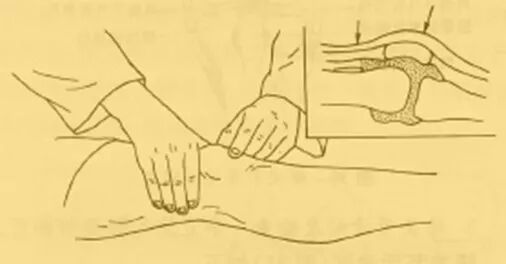 患肢伸直,医生一手虎口对着髌骨上方,手掌压在髌上囊,使液体流入关节腔,另一手食指以垂直方向按压髌骨,若感觉髌骨浮动,并有撞击股骨髁部的感觉,即为阳性征,表明关节内有积液。