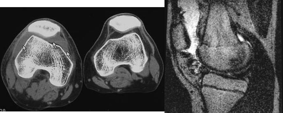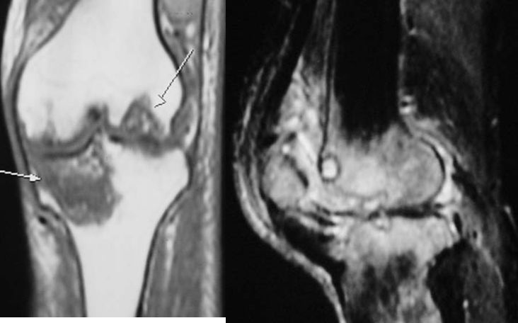 2、软骨下骨板硬化:软骨下骨板致密、硬化,负重软骨下骨质内可见囊性改变。