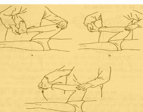 患者仰卧,医生一手,握住患肢足部,另一手拇指及其余四指分别摸住膝关节内、外侧关节间隙,先使膝关节极度屈曲,然后将小腿内收,外旋,并逐渐伸直膝关节,此时内侧膝关节疼痛或有弹响,说明内侧半月板损伤。反之使小腿外展、内旋,逐渐伸直膝关节,如有外侧膝关节疼痛或弹响,说明外侧半月板损伤。